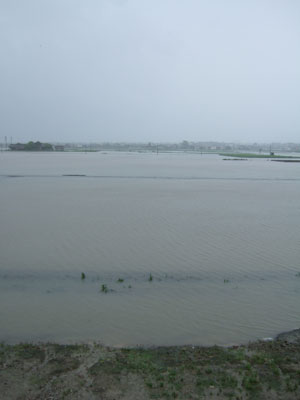 見てくださいよコレ。お米の苗が水浸しですよ。イキイキしてませんね。