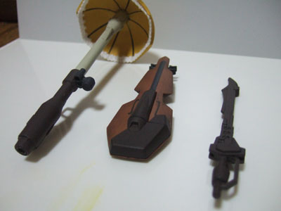 左から「ビームアンブレラ(双眼鏡付き)」「ヴァイオリンシールド」「弓サーベル」と言った所。