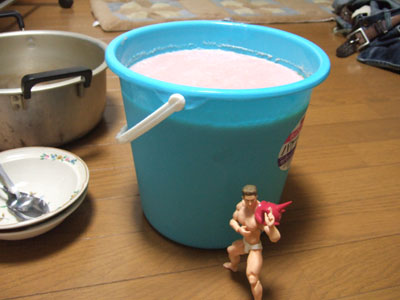 後はダイソーで買ってきた8ℓのプラバケツにカラメル→混合物の順に流し込みます。